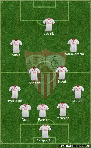 En las últimas jornadas, y dado el bajo nivel físico en el que se encuentra el equipo, Sampaoli ha variado el once bastante. Normalmente utilizada el sistema de 5 defensas aunque algunos partidos juega con 4 atrás. Jugadores como Franco Vázquez, Ben Yedder o Vietto han dejado de tener tanto protagonismo como en otros tramos de la temporada. Sarabia se ha convertido en un comodín para el técnico ya que juega en ambas bandas. Este sería el once más titular.